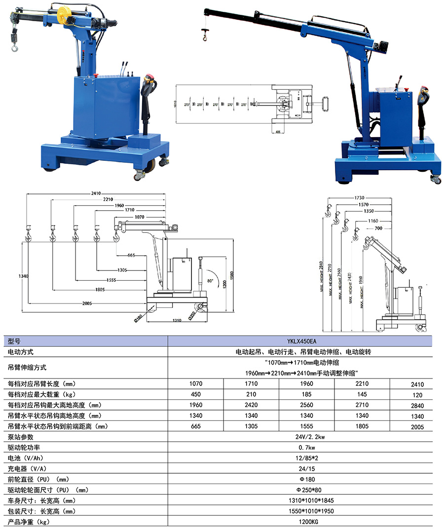 ● 電動起升,電動行走,吊臂電動伸縮,電動旋轉(zhuǎn)設(shè)計,省時省力,提高工作效率。