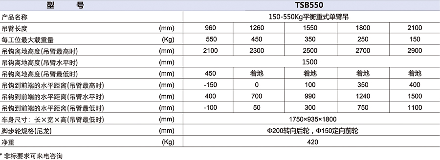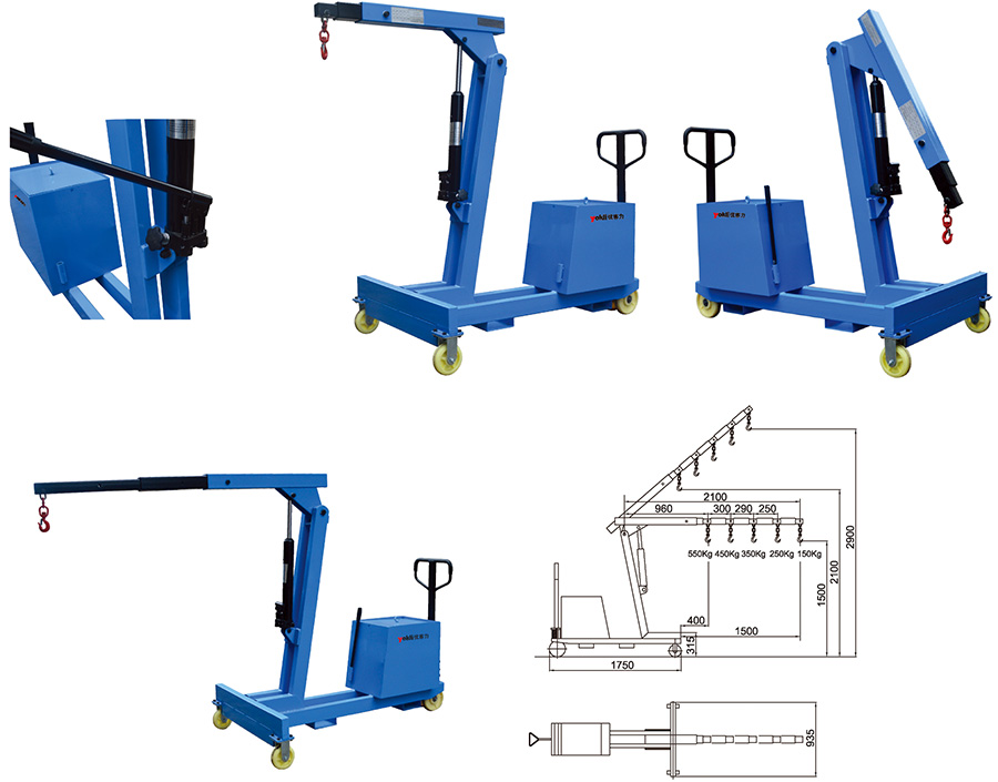 ● 吊臂長度可五工位手動調(diào)節(jié),配有鍛造重載可旋轉(zhuǎn)吊鉤。